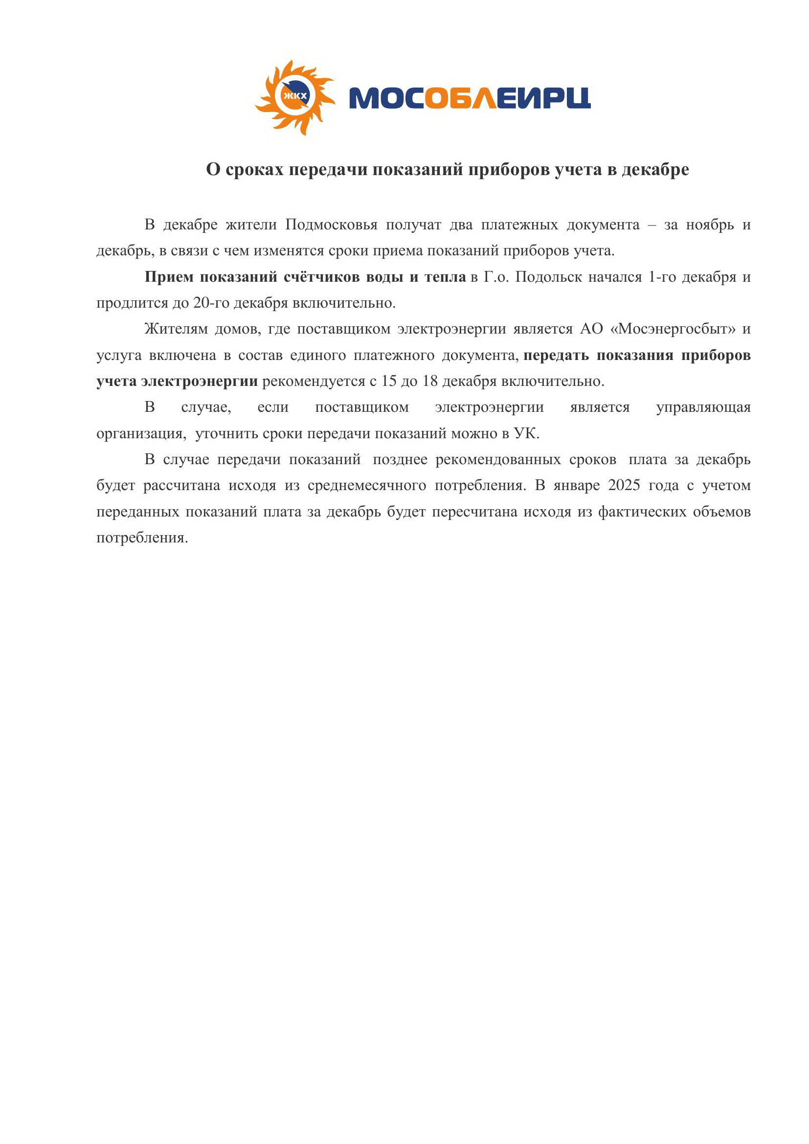 Информация для жителей о сроках передачи показаний ИПУ в декабре 2024