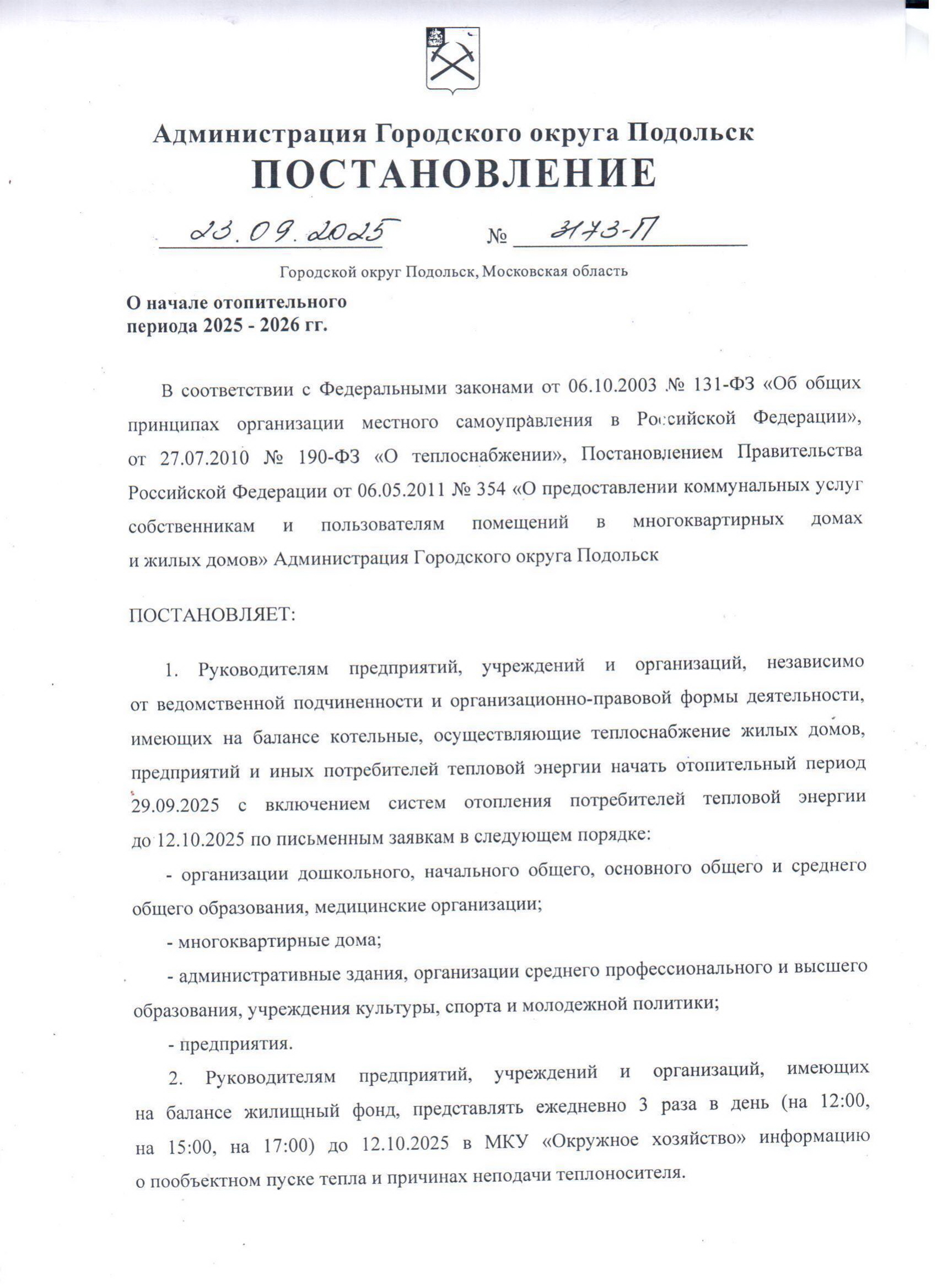 О НАЧАЛЕ ОТОПИТЕЛЬНОГО ПЕРИОДА 2025-2026 г.г.